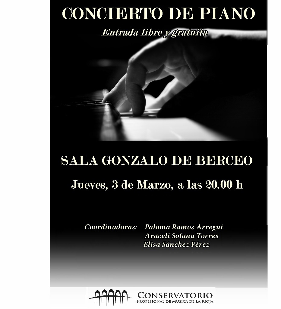 Si queréis asistir a un concierto distinto y especial, podéis acudir el Jueves día 3 de marzo a las 20 horas, a la sala Gonzalo de Berceo. Concierto gratuito y de libre acceso en el que los alumnos de enseñanzas profesionales de las profesoras Elisa Sánchez, Araceli Solana y Paloma Ramos interpretarán obras de muy variados estilos. Cada una de las interpretaciones llevará una breve explicación para tener una visión más completa de cada pieza. Remarcar que tras el comienzo del concierto a las 20 horas, se cerrarán las puertas de acceso al concierto, por ello rogamos puntualidad.