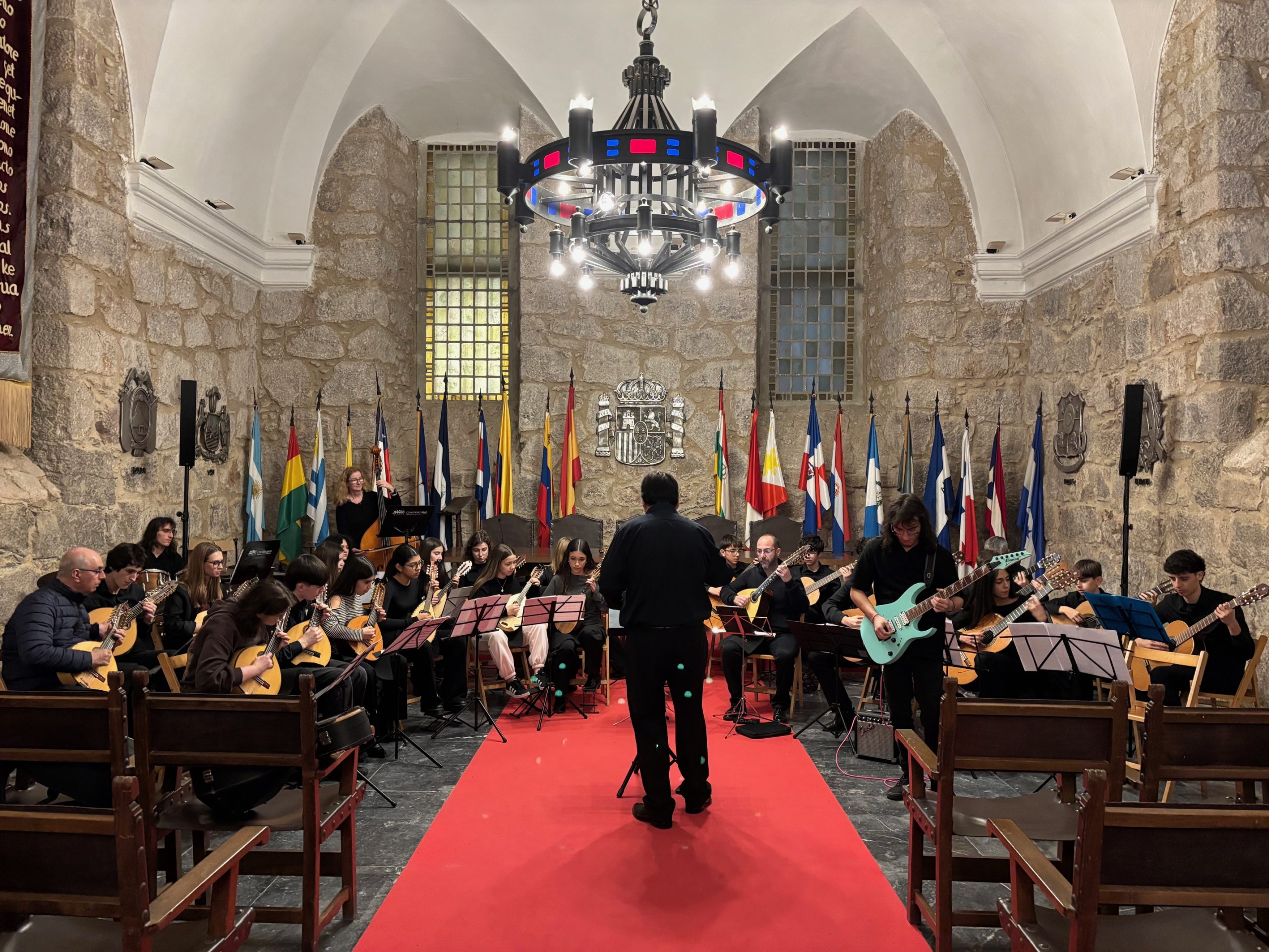 Posteriormente, las Orquestas de Enseñanzas Elementales y Profesionales realizaron las pruebas de sonido previas al concierto, que tuvo lugar a las 19:30 horas en el Salón de la Lengua del Monasterio de Yuso.