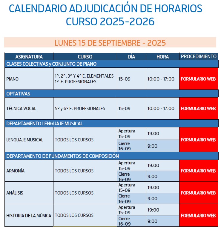 - Colectivas de Piano y Conjunto: 15 de septiembre, lunes, a partir de las 19:00h.