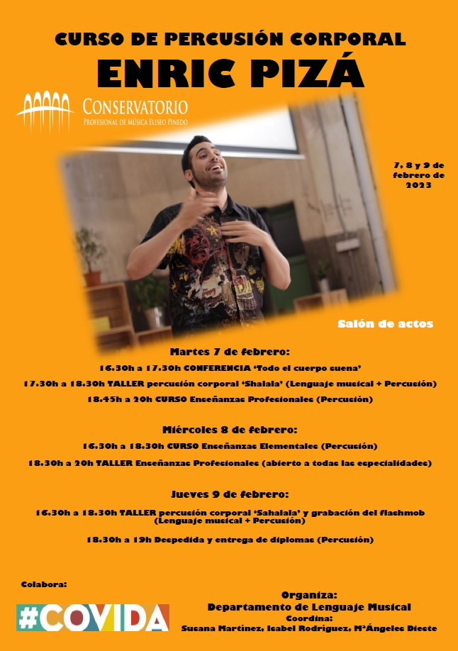 El próximo martes 7 de febrero comienzan las Jornadas de Percusión del CPM Eliseo Pinedo de Logroño con una conferencia sobre body music ‘Todo el cuerpo suena’ a cargo de Enric Pizá, especialista en percusión corporal. La conferencia tendrá lugar en el salón de actos del conservatorio a las 16.30h y será abierta a todos los públicos.